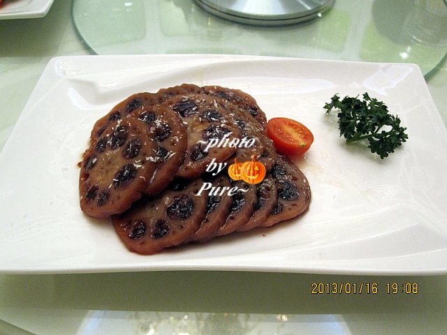 【自制黑糯米椰香糖藕】外面的桂花糖藕都是白陷的,这家却是黑糯米馅。夹起一片,带着桂花的清香和甜糯椰香糯米香的口感,让人陶醉。