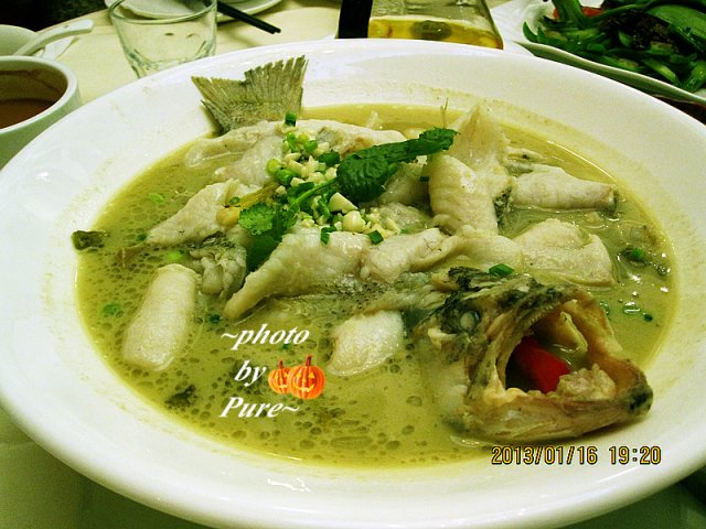 【惹味酸菜鲈鱼】大爱的鲈鱼烹饪方法哦。鱼片很嫩,经过处理后是没有鱼刺的。一片片切得很大块。一筷子夹起,雪白的鱼片让人食欲大增。微辣。汤汁又微酸。鱼嘴微张。特有意思。