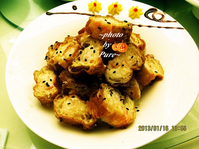 【手打墨鱼饺酿油条】这道菜大有来头哦。做油条的师傅是专门重金挖来的。油条口感很脆很香,里面的墨鱼条是个口感很神奇的填充物。入口充满了墨鱼的清香,但是不全是墨鱼,还混有香脆爽口的荸荠。鲜爽可口。