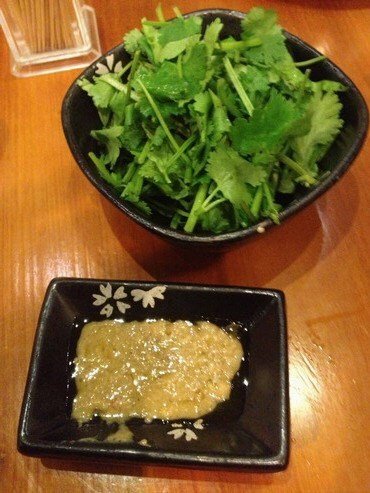 喝粥配的料:香菜和沙茶酱。第一次吃海鲜粥还带配料的,真是不错!