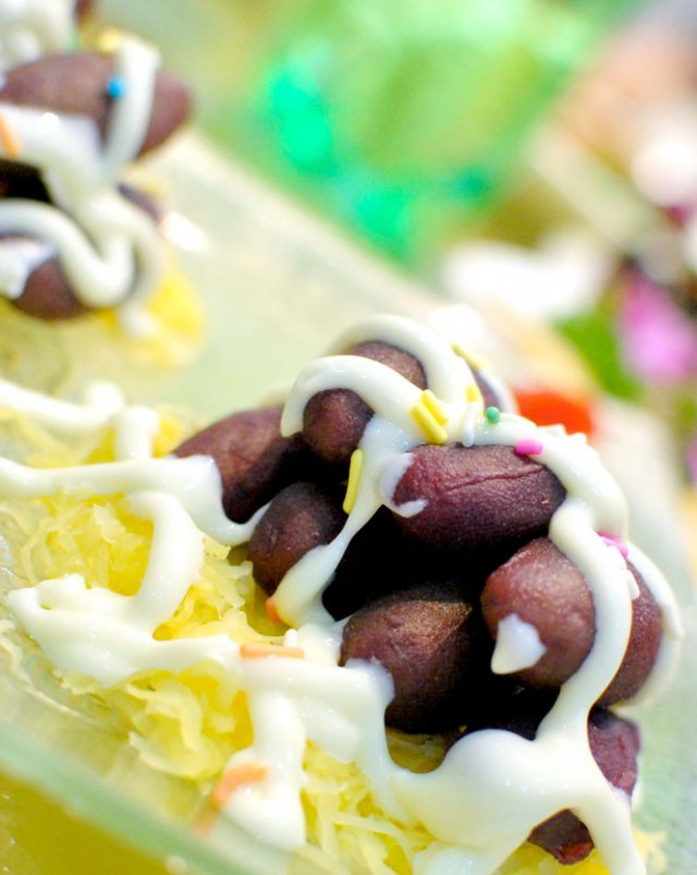 珍珠紫薯:果然是袖珍型的,一口一个,入口香甜、软糯,配上底下几口金瓜丝,感觉是在农家乐里面品尝农家粗粮。紫薯算是五谷杂粮之一,不但营养,而且健康。