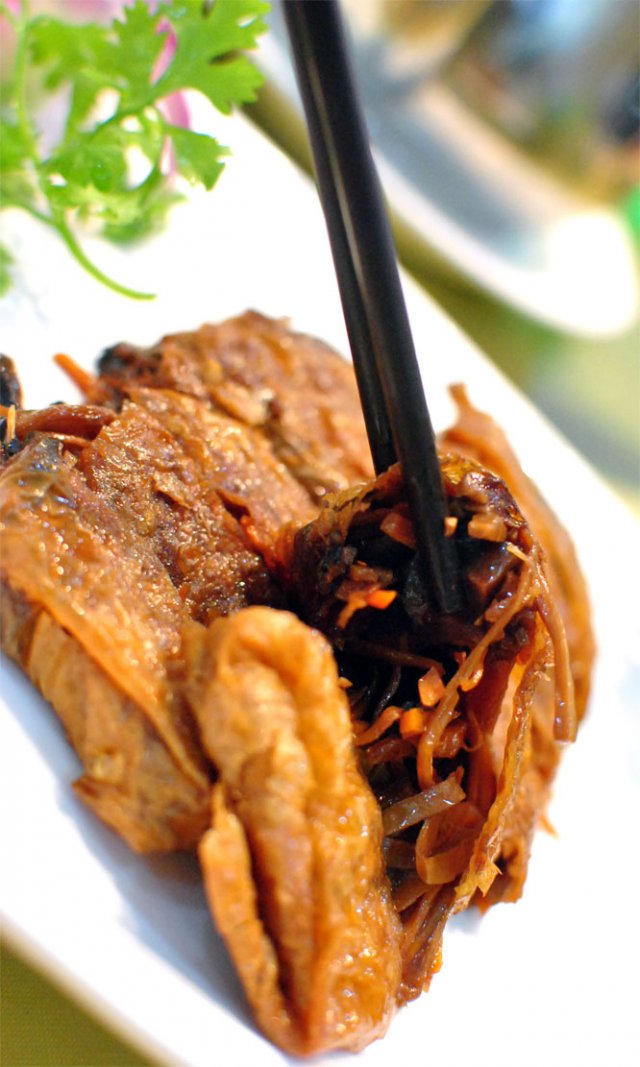 本帮素鸭:这素鸭跟外边经常吃的素鸭不一样的地方时,它不仅仅是豆制品。它只有外边一层是豆皮,里面别有洞天!香菇丝、萝卜丝、笋丝……你会感觉自己像是在吃春卷,这是我和同学都最爱的一道冷菜。馅足量多、皮薄馅多,超值!