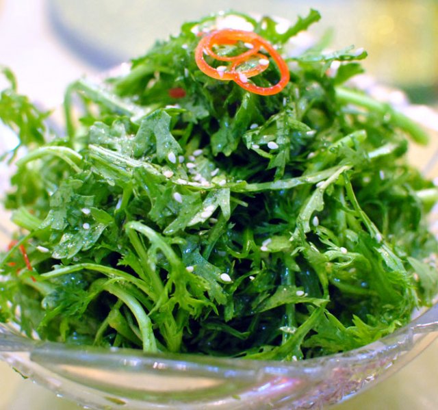 凉拌茼蒿:一湖碧翠枝叶上散落着白色芝麻点点,顶上一圈红辣椒独显娇艳。夹起几根蔬菜真是碧绿盎然,入口嚼几下那菜汁是饱满欲滴。很清脆爽口的一道菜,最适合在大鱼大肉之后。