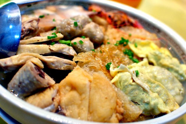 本地蒸三鲜:怎一个“鲜香”了得。看似大杂烩,里面什么都有,鸡肉、蛋卷、蹄髈、虾、丸子、肉皮、骨头……实则正是这些菜混合出了它特有的鲜。菜还未上桌,远远地就闻到了一股闽南煲汤特有的香味,同学还以为回到了老家呢。上桌后这道菜着实给了她很大惊喜,汤汁也是浓厚鲜香,蹄髈酥烂入味,灰常美容。