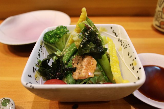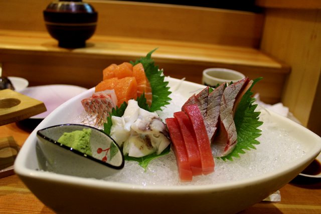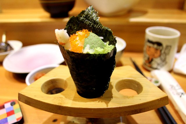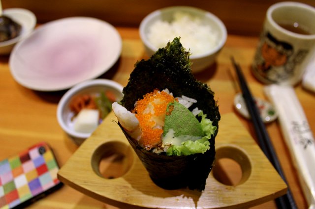 酒吞也长草了很久 就是对我们来说价格有点辣手 后来想说就吃他家的午市定食好了。 最近忌生冷的某人还是忍不住啊 两个人两份生鱼片定食 和风沙拉 赞的~里面有嫩玉米 生菜 紫甘蓝 烟熏金枪鱼 小番茄 酸酸爽爽很开胃 也适合夏天吃 蒸蛋 味道尚可 不过里面有一整只的海胆呀~ 泡菜 介个还是我做的比较好吃一点。。 味增汤 马马虎虎 生鱼片拼盘 推荐的 种类数量都很赞 虽然有两种吃起来筋筋拉拉 但是冲着这厚度和新鲜度,也要点赞~话说这些生鱼片吃下去,就已经很饱了啊 绿豆汤或咖啡 选的绿豆汤 绿豆煮到化在汤汁里,冰镇过的口感清爽甘甜 不错哒 这些只要118 吃好又单点了酪梨手卷 鱼籽 沙拉酱 ;酪梨 海苔 虾子 外加寿司米的完美结合 38米一只 海螺 很大 性价比确实高的 15米一只