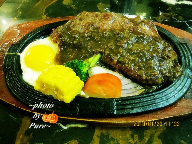 最后来说说西冷牛排,里面一个流黄蛋,一小块玉米和西兰花。牛排要了6分熟和黑胡椒酱,问题是牛排吃起来都是筋筋拉拉的,没法吃啊。。嚼了几口就吐掉了