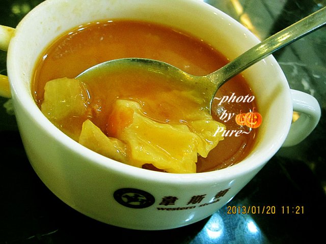 汤有2种,罗宋汤和酸辣汤。我只喝了罗宋汤。汤是要你点的,不过也是无限量。第一碗罗宋汤里面还有牛肉。后面几乎就是蔬菜,到后来蔬菜也没有了。只有罗宋汤。不过罗宋汤做得很浓稠。喜欢。喝了4碗。