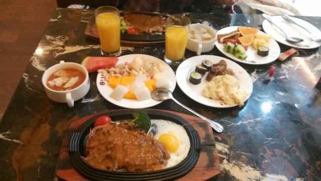 团购去的,团的是西冷牛排套餐。在金沙江璐那边,对面正好有个电影院,看完电影就过来了,他家的装潢虽不是很豪华,但简单又不失大方、典雅,里面的气氛很不错的。中午的时候人还是蛮多的,呵呵,但是基本以中老年还有小孩子为主,大概是便宜吧,所以比较吸引他们。服务生的态度也都很好、很热情,给人种亲和力。西冷牛排,就是普通的那种牛排,鸡蛋蔬菜牛排,牛排不是很劲道感觉,有点老了没有什么特别。自助餐种类蛮少,寿司啊、果冻、土豆泥、面包还有一些水果。土豆泥大爱啊,很好吃,不过过一会就被抢掉了,种类太少了感觉。味道么一般般吧,就冲个性价比高点。随便吃吃还是不错的。还是能吃很多的。