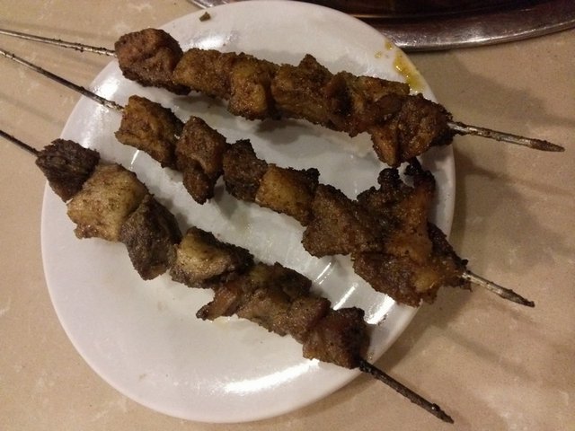 羊肉串,5块一串,肥瘦相间,不是一块肉有肥有瘦,而且一丁瘦一丁肥,大丁的肥肉清晰可见,无法直视!说实话,羊肉串很一般,没有烤制的那种香气~倒是我吃剩的肥肉丁老公很无聊的放在火上烤,滋滋冒油,真香啊!
