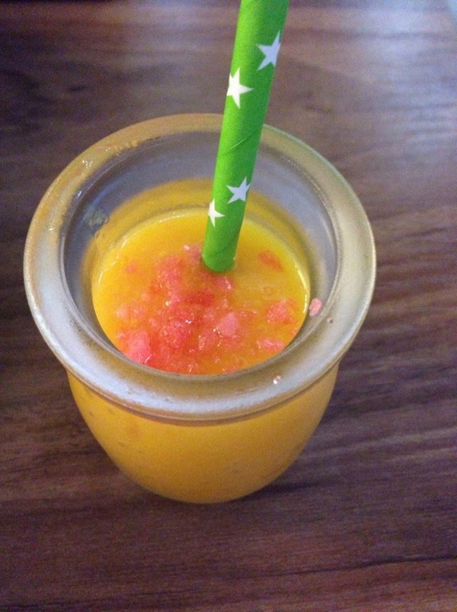 口味跟杨枝甘露里打底的芒果汁一个味道,上面红色的是小时候喜欢吃的跳!跳!糖!不过楼主长大了,这么不淑女的零食无爱啦,喜欢的朋友可以尝试下哦~