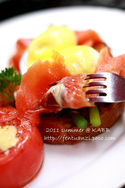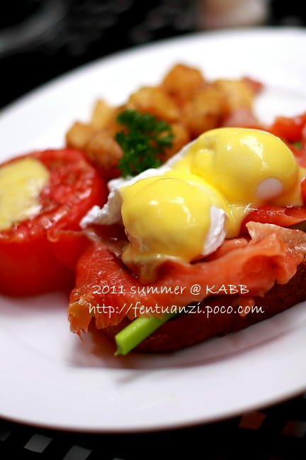 烟熏三文鱼水波蛋非常大的一盘,两个水波蛋,四片烟熏三文鱼,四根芦笋,一大片烘烤过的厚切面包片,以及一个芝士番茄和一大份培根炒土豆,口味总体偏清淡,内容丰富,美味而营养。水波蛋是半生的,嫩滑的口感,配上芝士的香浓,果然是招牌。烟熏三文鱼口感很棒,卷着底下的芦笋吃起来更赞。培根炒土豆因为加了黑胡椒来调味,所以口味稍微偏重。芝士番茄看似普通,香浓芝士是水嫩番茄的完美点缀。