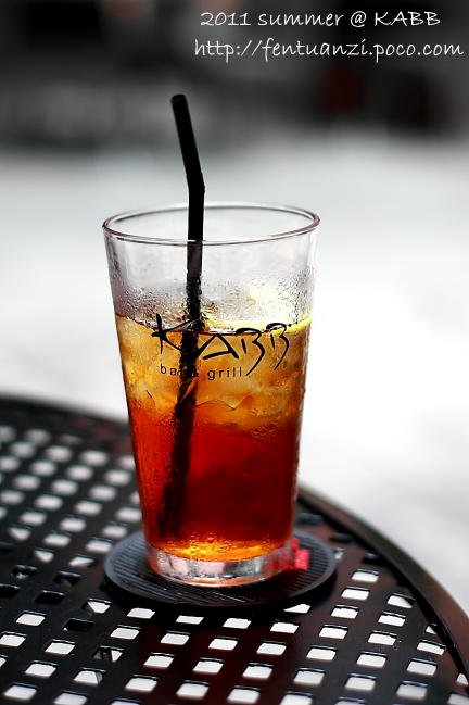 冰红茶的大玻璃杯上印有KABB的Logo,冰块加的分量不多,糖水另外分开自己根据喜好添加,冰冰凉凉的很适合夏天。