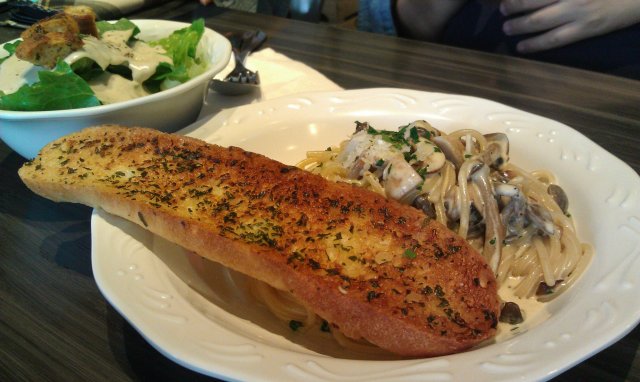 松露汁野菌意粉,准妈妈点的,觉得很CREAMY,很有奶香,很爱~即使吃完也不觉得有腻感~香脆的蒜香包,觉得吃完有点干~