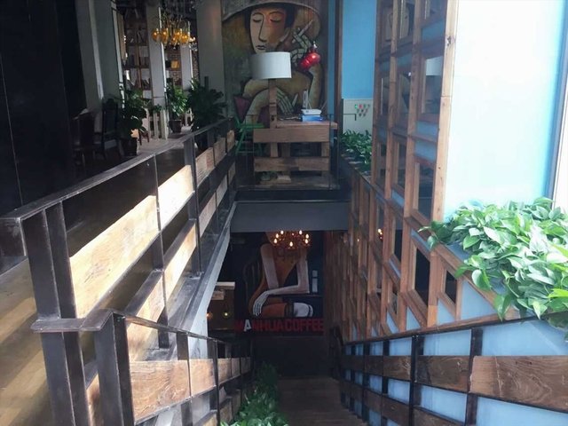 两层的挑高设计,光线暗暗的,原木的桌子,还有随处可见的绿色植被,