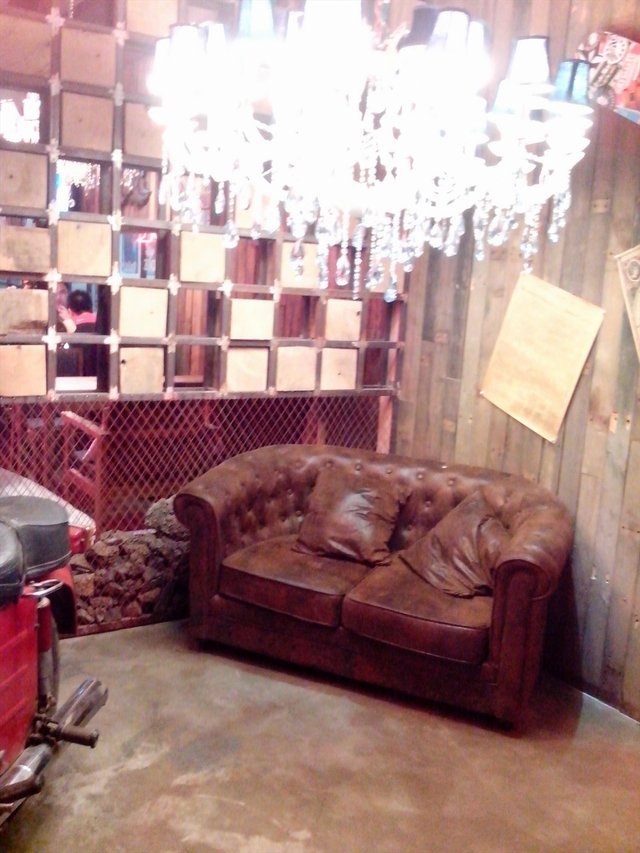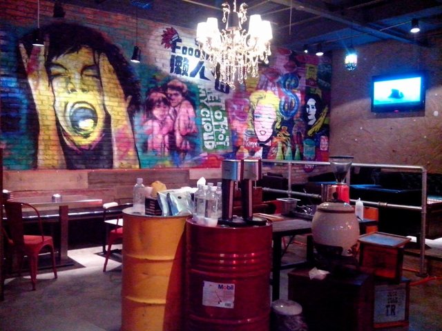 到了门口就觉得环境还有点特色,有点美式复古的感觉。门口的摩托车,沙发,墙上的装饰画,灯具等等,都在突出着这一点。不过环境装饰的元素有点过多,还有一些别的风格的元素在里面,反而没有突出的特点了。