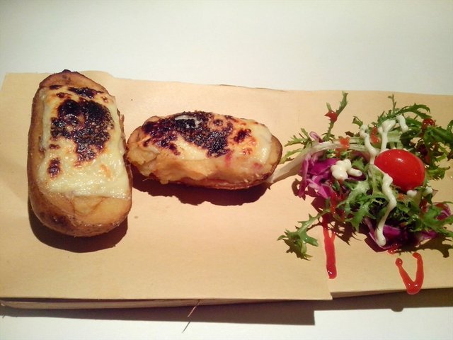 第一个土豆芝士,就是一个椭圆型的土豆一切两半,土豆泥调好佐料再放回去,上面的铺芝士,问题就在于,芝士都烤糊了。不用餐具的最终后果是,东西都太烫了,我等了好一会,才能拿起来吃。