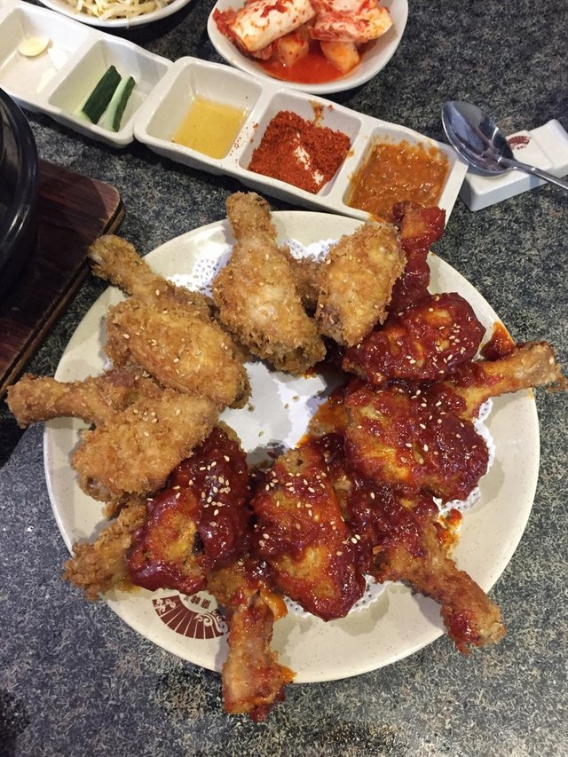 炸鸡是分两个味道的,就是一个原味一个淋了甜辣酱的。外壳酥脆,鸡肉娇嫩多汁。