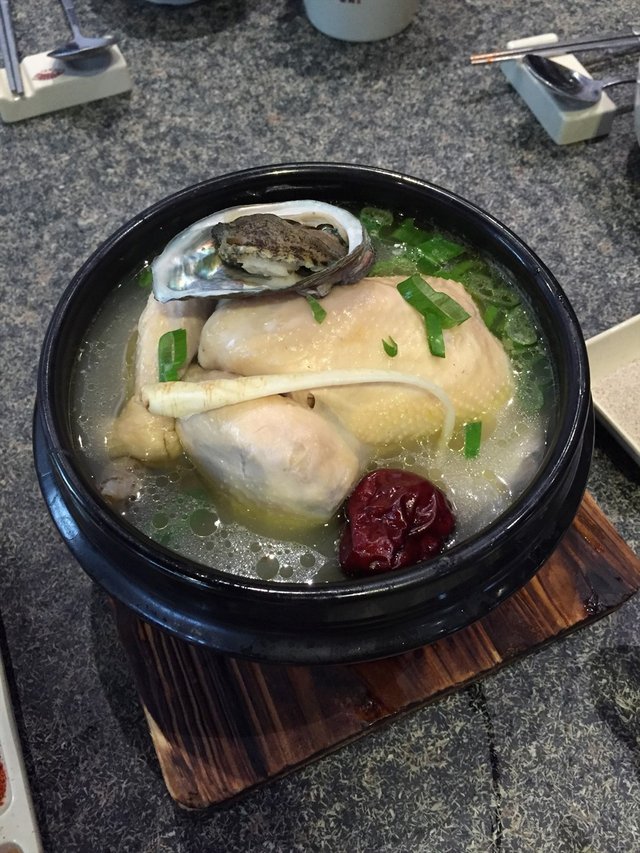 这个是一道很有乾坤的大菜。人参砂锅煲的整鸡,鸡肚子里面有红枣糯米。