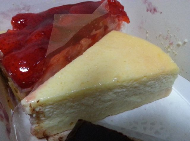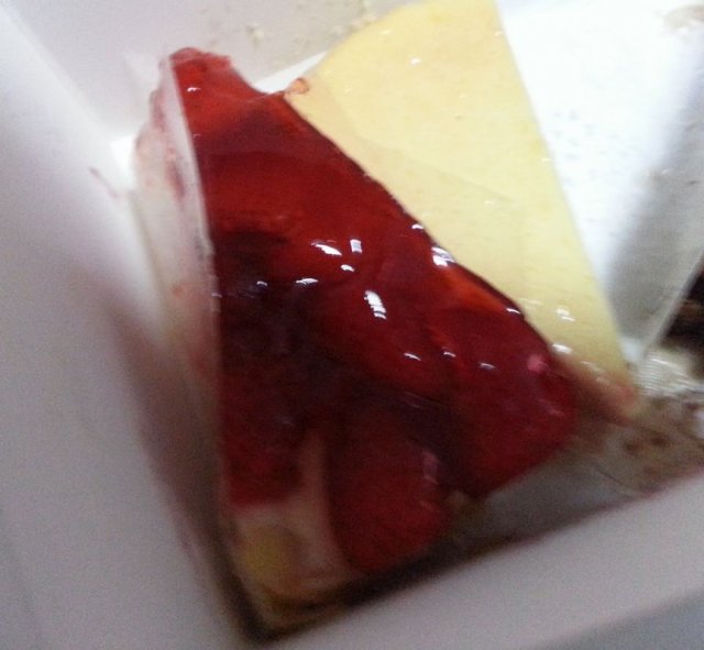最后一快是草莓芝士蛋糕,上面一层鲜草莓做成的草莓酱,覆盖着草莓糖浆的爆浆,草莓经过处理,柔软细腻,去除了微酸的口感,留下的都是甘甜。搭配下层的芝士蛋糕,混搭的口感在味蕾上跃动。适合喜欢吃草莓的人。