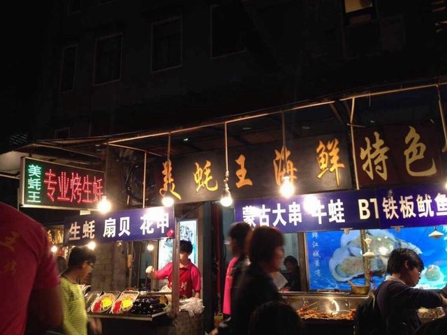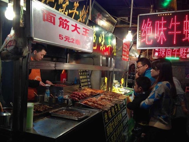 户部巷一到晚上7点左右就是另外一番景象了,宵夜铺撑起一盏盏灯泡,架起简易折叠桌和塑料凳,露天大排档就搭起来。虾子、烤生蚝、牛蛙和面筋、炒螺丝、羊肉串什么的应有尽有。