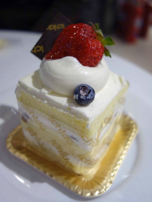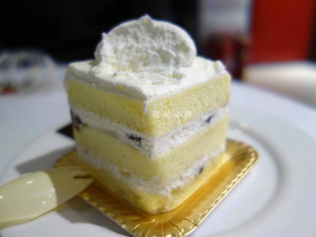 基本款的鲜奶蛋糕,一颗红彤彤的大草莓,娇艳欲滴。冰凉醇正的奶油在舌尖慢慢绽放,入口即化,很清淡,蛋糕层细腻绵密,偶尔吃到嵌入其中的提子,着实是个惊喜