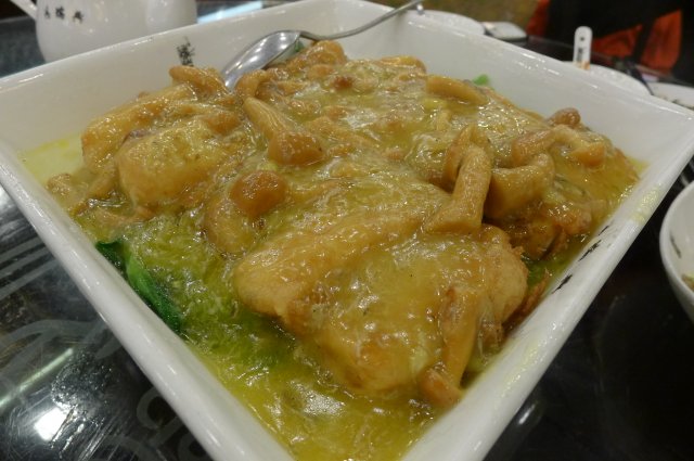 @蟹粉锅贴豆腐/38块,其实就是个煎豆腐,外面撒点蟹粉,但跟锅贴得什么噶呢?这个豆腐因为切成一大块一大块的油里面煎了下,所以外面一层是比较坚硬的,筷子捡的话是不会碎掉的。里面的蘑菇味道还不错,但是这个菜有个问题,就是吃到第二口就发现没什么味道了,因为豆腐太大,味道进不去,一定要再去沾沾那个蟹粉酱才行,像我这种不喜欢吃豆腐的对他就无爱了。。。最后还剩了好几块没吃掉