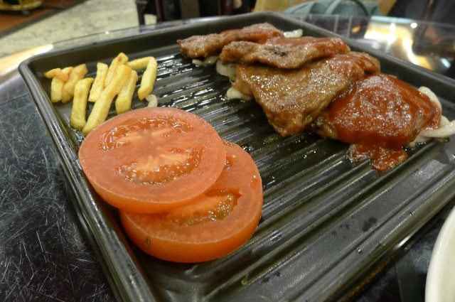 @鸿瑞兴特色煎牛排/13块一块,这个牛排还有一种是黑椒的,不过我看推荐好像这个不错,那就来份吧,正好是4块起售,我们四个人一人一块。牛排个头不大,但他稍微还有些配菜,比如番茄片啦,薯条啦,就是没想到薯条都是冷的。。。太难吃了。。。估计是最好很久放在那里的。。。这个牛排就是茄汁的,上面浇了点番茄酱,肉质还可以吧,但是没有我想象中的那么好吃,而且太小了!!!