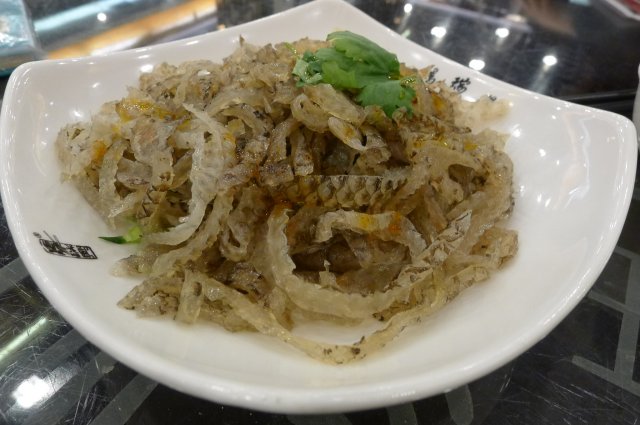 @冷炝鱼皮/18块,这个是狂风同学吃过好几次后推荐的,其实她本人不喜欢吃鱼,但是这道菜完全没有鱼腥味,感觉还是不错的,于是我们就点了。其实我也不是很喜欢吃鱼皮的,原因不详,可能是被我爹从小培养,鱼皮都归我娘。。。这个鱼皮倒是挺厚实的,吃上去不是很脆的那种,比较有咬头,但是有点清淡,如果配着话梅虾的汤汁吃倒是很不错~就是服务员太勤快了,速度把那盆吃完的虾端走了。。。搞得我们鱼皮最后也没吃完