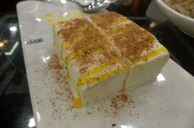 @冰糕/20块,这个看上去感觉就是小时候吃的冰砖,但是上面还撒了一层黄黄的粉,不过没吃出来那个粉是什么。冰糕倒是跟我在另外一家饭店吃到的味道差不多,但这个味道总觉得不是特别的正,可能是少了点什么吧。。。这个化掉以后不像水,而是有点象烂泥的感觉