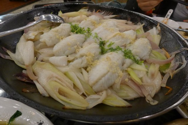 @焖煎黄鱼腩/45块,这也是那位不爱吃鱼的同志推荐的菜,她说她吃了几次鸿瑞兴,感觉这两种鱼还算不错的。里面大概有十片黄鱼腩,肉看着还挺厚实的,白白嫩嫩。这个鱼下面好像有加热的,所以不用担心他会冷的太快,但不管怎么样也要先抢一块过来~黄鱼肉我还是很喜欢的,尤其是红烧的,这个算是大葱清蒸吧,没啥腥味,而且很嫩,不过就是口味清淡了些,而且下面要是有洋葱可以煎着吃吃就好了