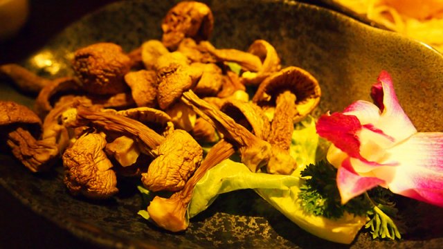等原汤食用完之后,服务员为我们在汤底中加入了金松茸,并曰此乃第二味道--山珍.随着金松茸的沉浮,它在汤汁中缓缓着释放着它的日月精华,体型慢慢地也开始舒展开来,让自身一并融入到这汤汁中去.乳白色的汤汁开始慢慢的转成淡金的色泽,也渐渐飘出了菌菇特有的鲜香味,而刚被原汤滋润过的小伙伴们又再次被勾起了馋虫.小试了一碗,第二味山珍比起刚才第一味的口感,又在鲜浓的基础上多添了一分松木的清香,同时入口慢慢品会感受到金松茸特有的回甘.在坐友人们的面色也被淡金色的汤汁衬托得更是红润.
