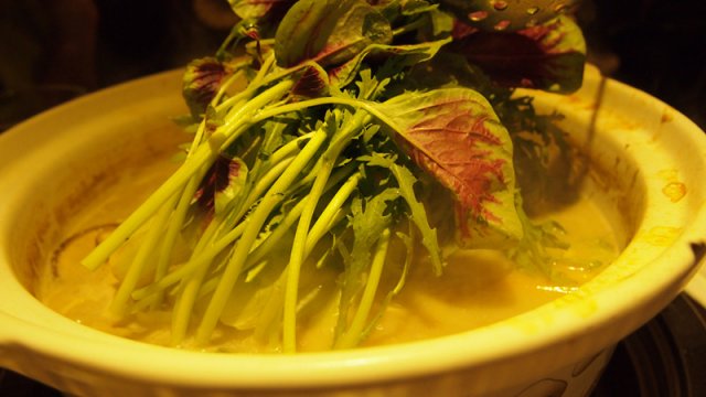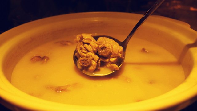 下完单后服务员端上来了一个盖着盖子的砂锅,用巨型来形容它的体积一点也不过分,目测锅子的口径就比两个人的脸还大.炖了不一会儿砂锅就开始嘟嘟地往外喷白气了,服务员帮忙打开锅盖的瞬间一股香气从锅中冲了出来,等蒸腾的白雾散尽之后定睛望着那欢快翻腾着的白汤.这画面让人不自禁的会口水直流,迫不及待地想去尝试这美味.