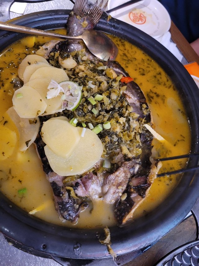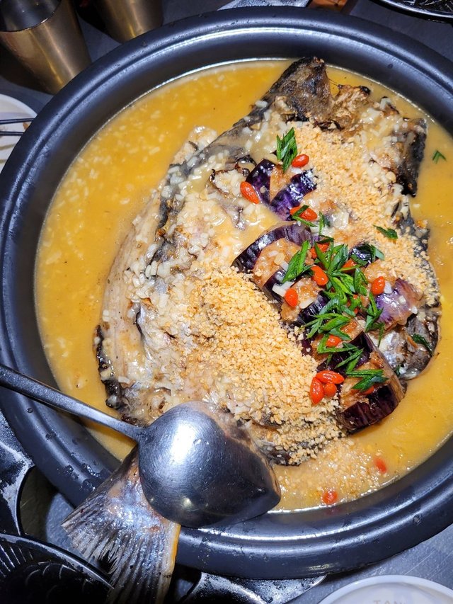 雙重蒜香,金蒜的香脆和白蒜的香辛相融合,沒想到兩者這麼搭,魚肉外焦裡嫩,每一口都浸透了蒜香的濃鬱與鮮美,鮮嫩魚肉滿滿,底部鋪滿爽口的青筍、土豆等配菜,完全吸收了魚湯精華,煮必吃,烤魚控煮越好