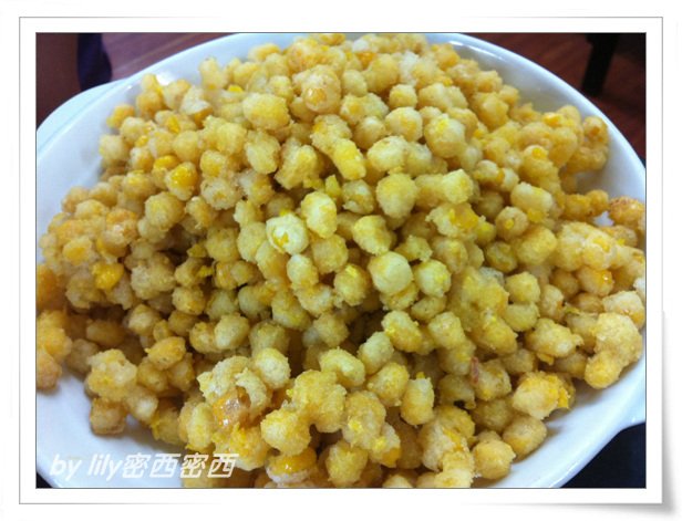 黄金玉米粒:同样的量大,超大一盘,咸酥的玉米粒口感很好,但是这个一定要趁热吃,凉了口感会大打折扣哒。
