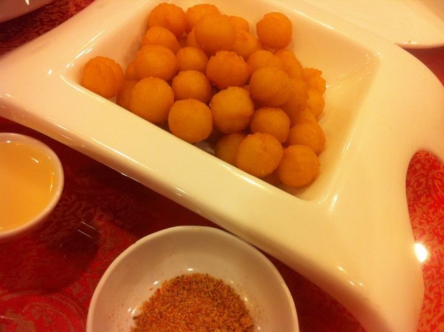 【特色炸小土豆】26元。太太太好吃了!!!土豆球绵密至极,奶香十足,外酥内软,蘸着炼乳,艾玛,没治了!平时喝口甜水都要斤斤计较热量,结果今天逮着这道菜就是不松手,大半盘子都是我干掉的!长两斤肉也值得的味道呀