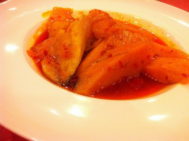 【压锅红薯】20元。对口儿!大块大块红彤彤的红薯,看着就喜庆!没想到夏天还能吃到这么甜的红薯,配上万无一失的鱼香口儿,幸福的跳舞转圈圈