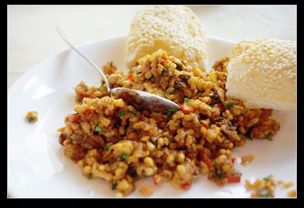 松子鸡米,饼皮薄而酥脆,填入炒好的松子鸡米,很是美味