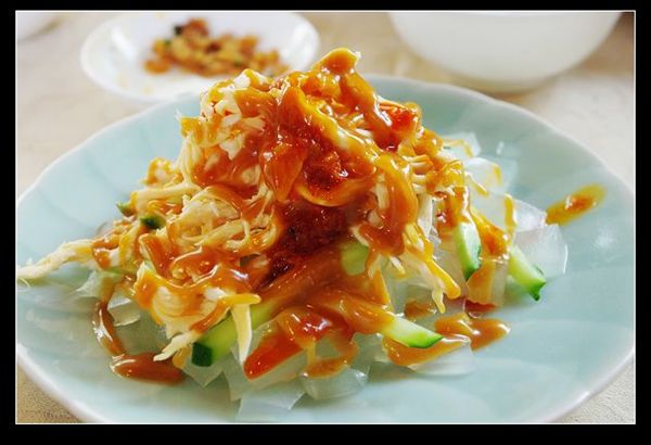 麻香棒棒鸡,鸡丝配之麻酱,自己淋了些许辣油,无论是观感还是口感都很赞