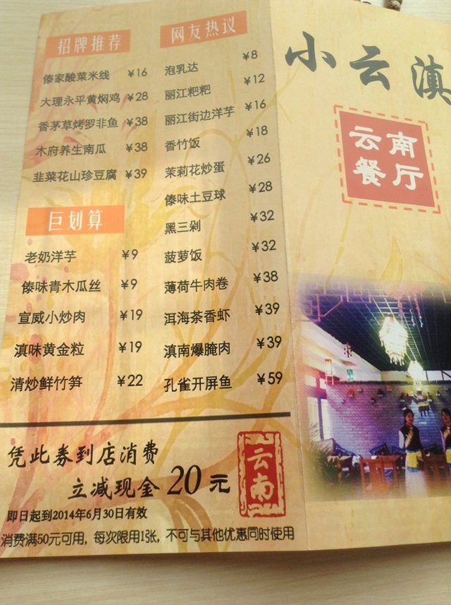 新开的小店,八错,八错~~~ ilovepuppy87等級42014-05-19 關注 介个小店是刚开的呢,经常在地铁站附近发优惠劵,有了这个就可以减现金20,很值哦~~~在长虹风情街,环境还是很好滴,店面看起来古色古香的,里面都是木头桌椅,挺干净的,感觉还行,服务人员不是很多,所以叫不来呢。 丽江粑粑不贵,才12米,口味一般,不太酥脆呢,感觉做好了,然后需要的时候热一热呢。泡乳达味道很好呢,8米很值哦~~~滑滑的,哈哈,很好很好~~~薄荷牛肉卷38米,爽口好吃~菠萝炒饭不错,菠萝味道很浓。 两个人花了一百多,但是有优惠劵,减了20,很值哦~~~但是口味一般,试一试就好了,哈哈以上食評乃用戶個人意見 , 並不代表OpenRice之觀點。讚好分享新开的小店,八错,八错 小云滇云南餐厅 https://s.openrice.com/KtbT300VRuA00檢舉 張貼 評分4味道4環境3服務5衛生5抵食人均消費¥40 (晚餐)