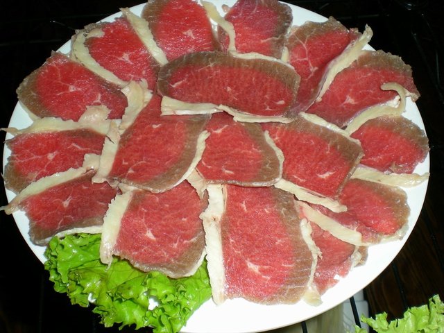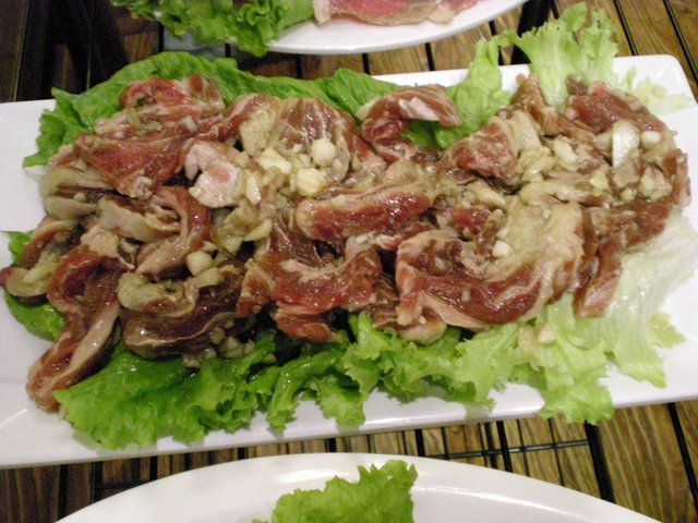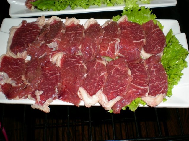 肥牛:最早烤的,薄片状的。因为不知道火候,吃的时候很老了,应该很好熟