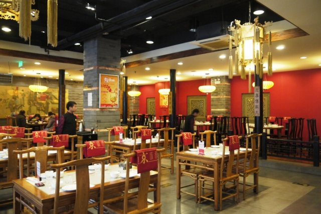 店内也是中式的风格,进门对面是收银台,左右两侧各有一个大厅是就餐区,木桌上镶着石头面板,木制座椅也颇有古风,右侧大厅里还有一棵大树,虽然是假树,却给屋内增加了一些生机。服务员的穿着也是中式风格,朋友去卫生间时无意中看到了他家的着装规范,其中要求得非常细致,而且不同岗位的着装甚至发型都有很详细的规范,可见管理还是比较正规的。