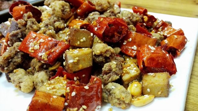 超级推荐,牛肉、豆腐干、花生、辣椒的搭配,令这道菜可以满分处理了