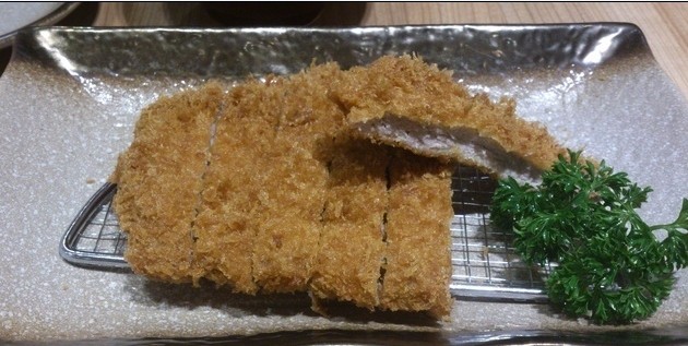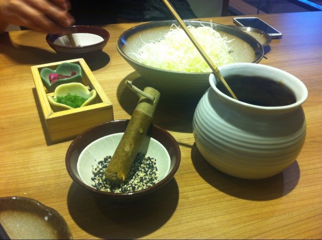 赠送的是红萝卜和裙带菜的小菜,还有一大海碗很细的菜丝,淋上他家特有的芝麻酱,甜脆解腻。这个我比较爱,猪排吃多了腻的吃不下会喜欢吃这个。还有赠送的热茶水,味道甘苦,但很解渴。