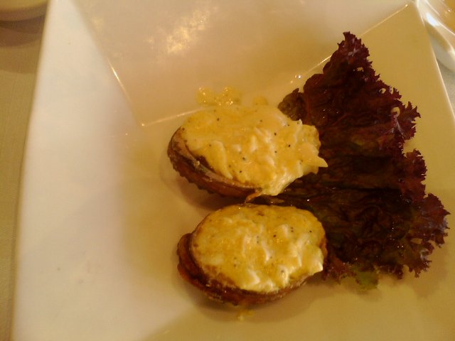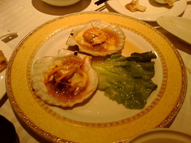 这个六头鲍个小小的,上面很厚一层咸蛋黄,挺咸的,不怎么喜欢。鲍鱼小小一块,真心一点点,不过味道不错,很鲜,没有毁掉这个鲍鱼。我朋友差点没吃到鲍鱼的说。嘻嘻