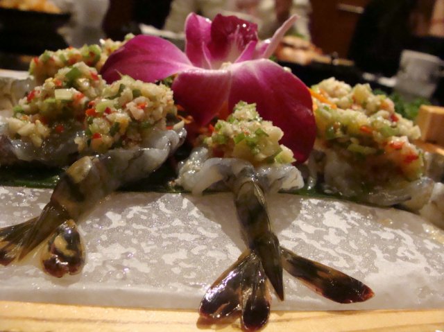 第五道酸辣生虾,旁边男生是潮汕人,生吃海鲜小意思,毫不犹豫下手了,新鲜的九节虾刨开置于冰上,上面放一撮辣椒蒜头柠檬,美味啊!某女生思虑再三,还是忍住了,内陆胃口确实要慎重。