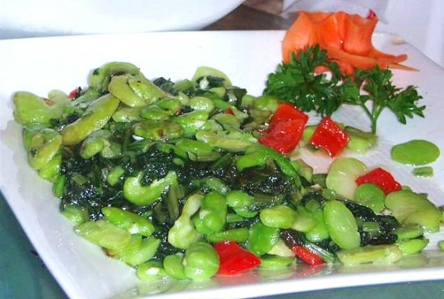 一道素菜,具体名字不知道,主菜是蚕豆,配菜是腌制过的绿叶菜,整体口味咸香清爽,在一桌子菜里算得上是个小清新。