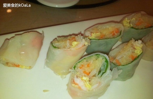 看上去比较清淡,外面米纸包着黄瓜,胡萝卜,虾...大家都说好吃,可惜考拉不能吃~~