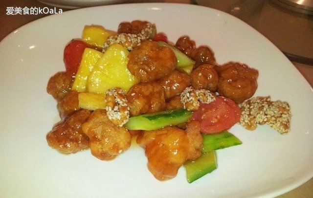 内容是蛮丰富的,菠萝,核桃,黄瓜还有肉~味道还行,是难得吃到的不是那么肥的古老肉~但是偏甜了点。。。