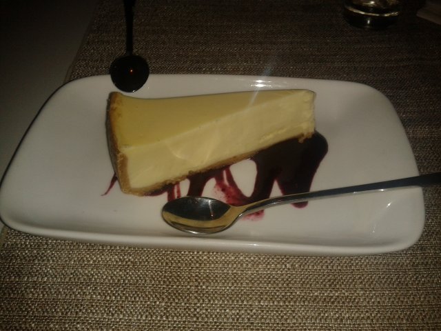 纽约芝士蛋糕,本来吃完了,我觉得挺饱的,但是同事想再来份甜品我们一起吃吃。看菜单觉得那个脆皮抹茶冰激淋很诱人,可是同事戒冰激凌很久了,说是不能诱惑她开戒,好吧,那就听她的,点了一份纽约芝士蛋糕。平时我不是很喜欢吃芝士蛋糕,不过尝了一口之后,觉得他们家的我可以接受哦,虽然是重芝士,但是不会觉得肥腻,也不太甜。本来看到盘子里涂了黑黑的汁,以为是巧克力酱,后来发现是蓝莓酱,芝士蛋糕配蓝莓酱,绝配啊,酸酸的蓝莓味真好跟芝士的厚重味中和,灵的呀!