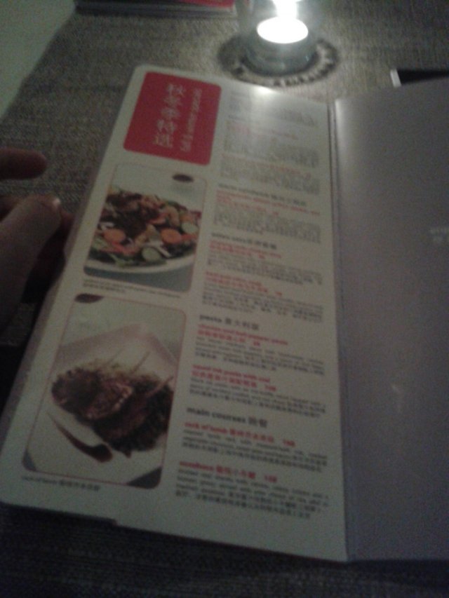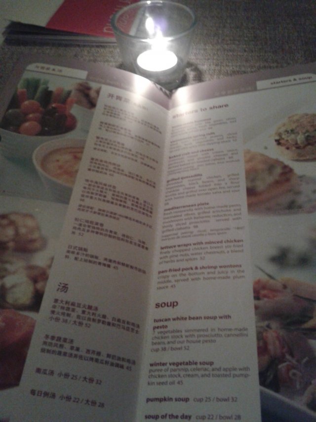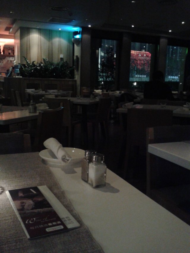 我倒得早些,先坐好了位子,一坐下,服务生就会过来帮你把桌子上的蜡烛点亮,很巧的是他们竟然安排了我坐在了三个月前我来吃饭时相同的位子上。二人桌,地方很小,走进走出要侧着身子。我等朋友的三十分钟左右时间里,服务生会过来问我要不要先点喝的,态度还不错哦!